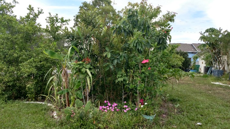 Judy relaxes with a cold drink after picking some lemons from the tree on the right.